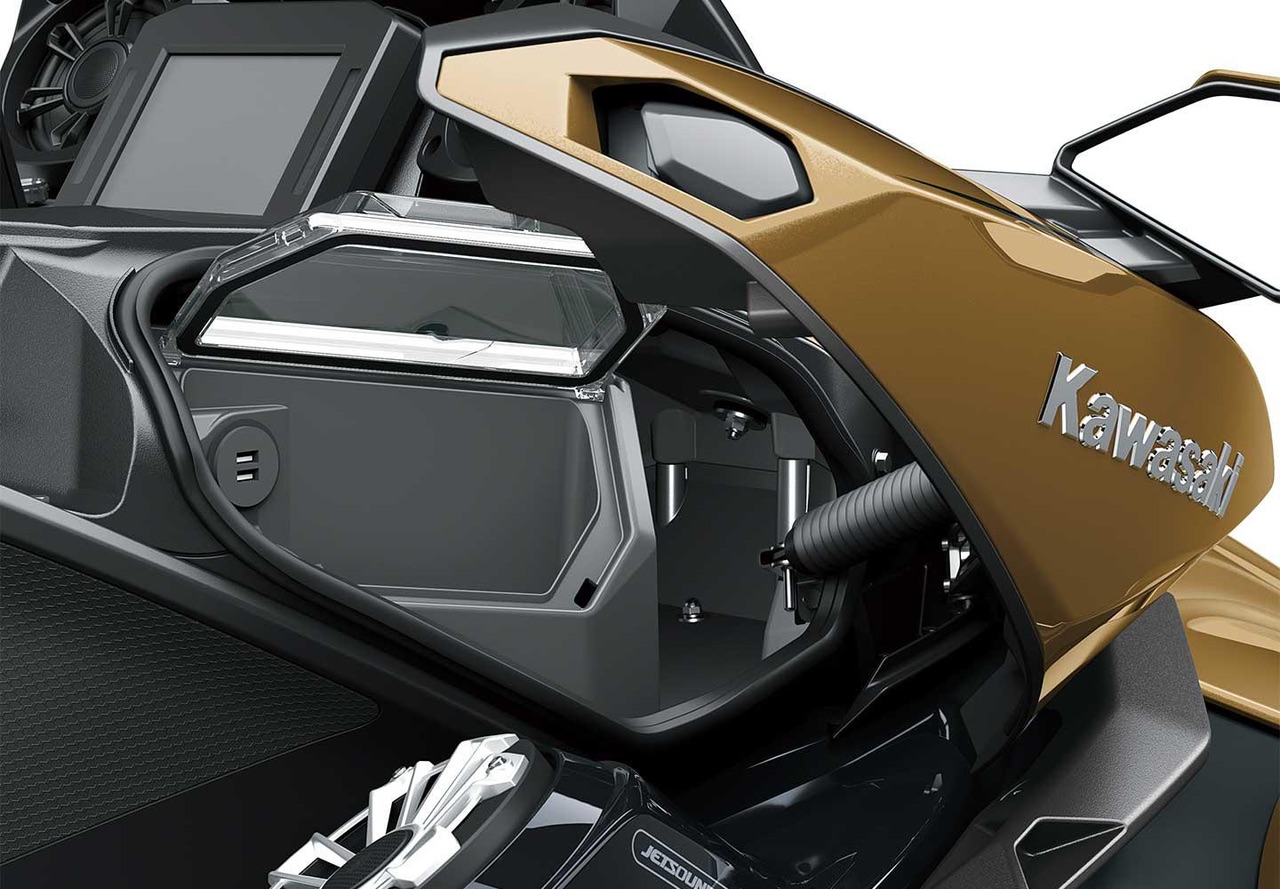 Combinando com os principais modelos de Jet Ski da Kawasaki, uma série de novos equipamentos e recursos oferecem conforto e conveniência significativamente maiores. O novo compartimento de armazenamento de fácil acesso, a câmera de ré e o sistema de áudio com quatro alto-falantes são novidades inéditas no mundo da PWC.