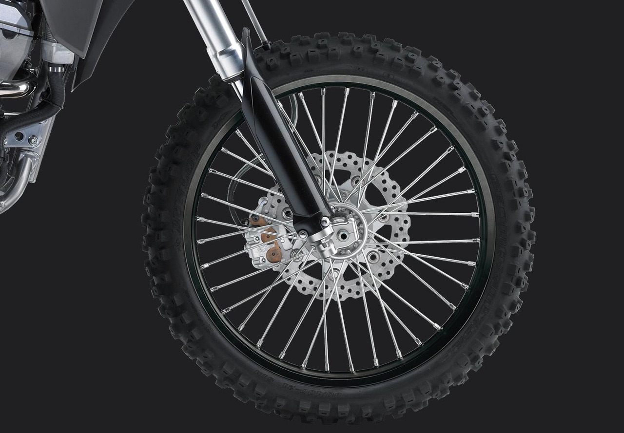Rodas de tamanho normal e freios a disco potentes tornam a KLX300R pronta para terrenos off-road difíceis.