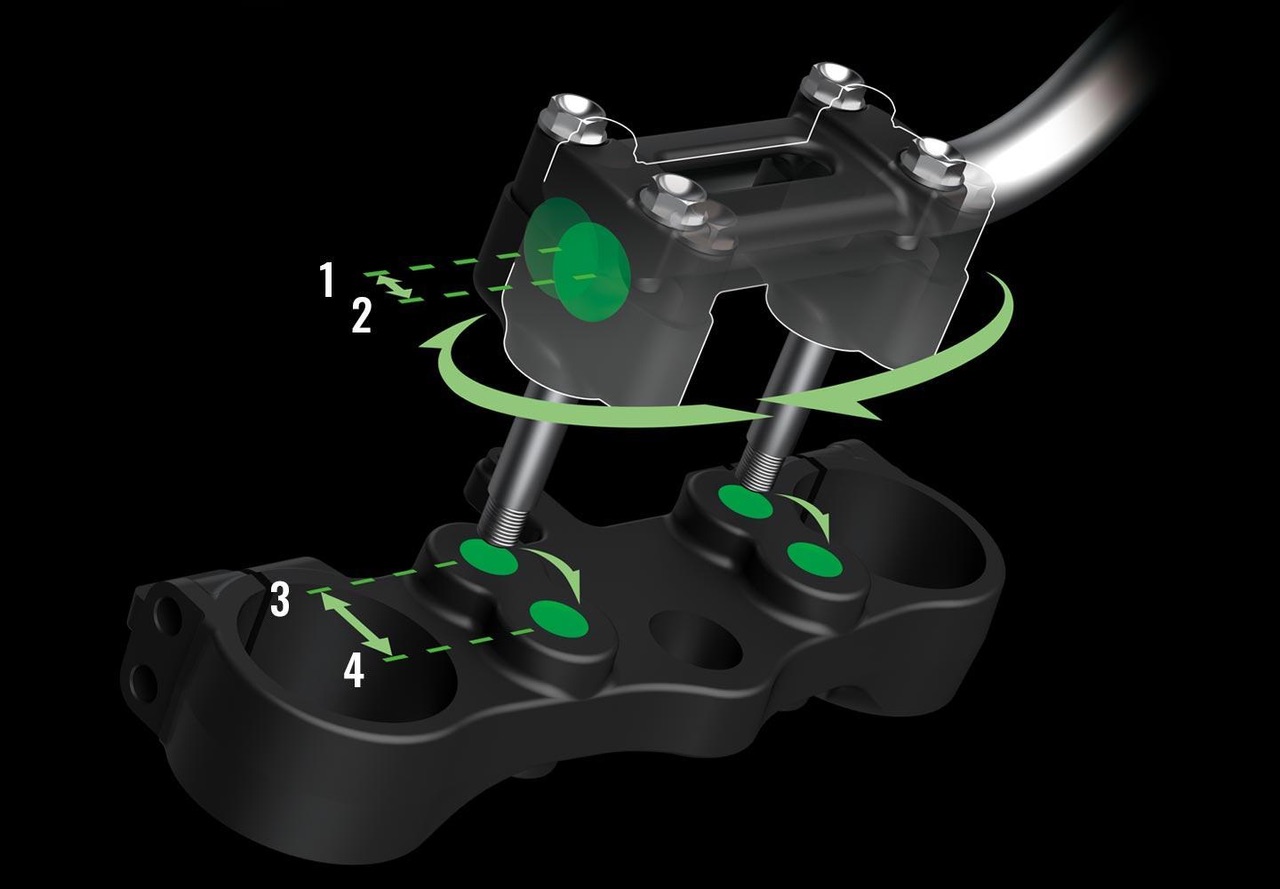 Adapte a KLX300R ao seu tamanho e preferência com as posições do guidão ajustáveis em quatro direções ERGO-FIT.