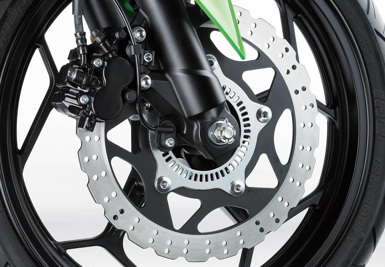 A aplicação excessiva repentina dos freios ou a frenagem em superfícies de baixa aderência, como asfalto molhado ou tampas de bueiro, podem fazer com que as rodas da motocicleta travem e deslizem. O ABS foi desenvolvido para evitar tais incidentes. Os sistemas ABS da Kawasaki são controlados por uma programação de alta precisão e confiabilidade, formulada com base em testes completos de inúmeras situações de pilotagem. Ao garantir um desempenho de frenagem estável, eles oferecem segurança ao piloto, o que contribui para um maior prazer ao pilotar. E para atender às necessidades especiais de certos pilotos, sistemas ABS especializados também estão disponíveis. Por exemplo, o KIBS (Kawasaki Intelligent Anti-lock Brake System) é um sistema de freio de alta precisão projetado especificamente para modelos supersport, permitindo que a pilotagem esportiva seja apreciada por uma gama mais ampla de pilotos. E ao conectar os freios dianteiro e traseiro, o ABS K-ACT (Kawasaki Advanced Coactive-braking Technology) fornece a confiança necessária para aproveitar as viagens em modelos pesados. A Kawasaki está continuamente trabalhando no desenvolvimento de outros sistemas ABS avançados.