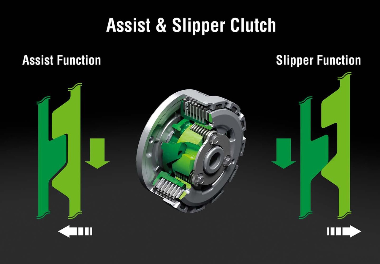 A embreagem Assistida e deslizante da Kawasaki resulta em um acionamento leve da embreagem para uma pilotagem ainda mais amigável e gerenciável em situações cotidianas, e reduz o travamento da roda traseira para uma melhor pilotagem esportiva e maior confiança.