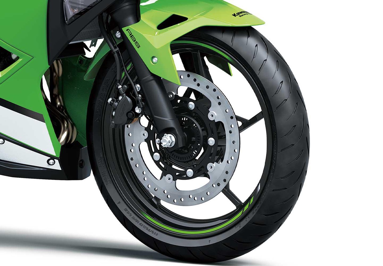 Medindo ø310 mm (o mesmo tamanho de disco usado na Ninja ZX-14R), o disco dianteiro semi-flutuante da Ninja 500 oferece poder de parada seguro. O ABS oferece maior segurança ao pilotar.