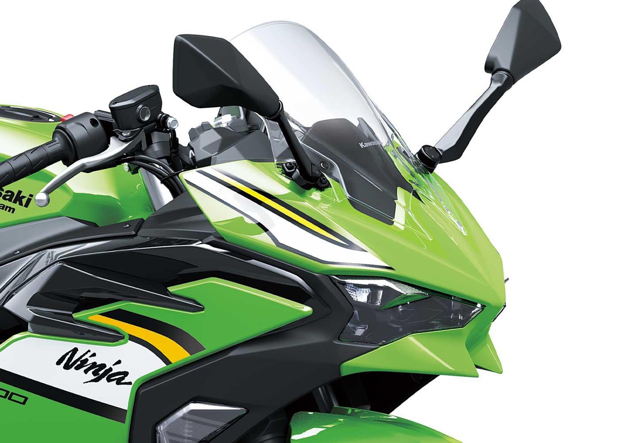 Faróis híbridos compactos de projetor/refletor - como os da nova Ninja ZX-6R - são um elemento-chave da face da Ninja 500. Os médios dos faróis são compactos e de plástico (tecnologia LED monofoco), enquanto os máximos e as luzes de presença são lâmpadas do tipo refletor. A posição profunda dos refletores das partes apagadas dos faróis faz com que pareçam escuros, criando uma expressão feroz. As extensões pretas entre os médios e os máximos contribuem para a imagem em preto e ajudam a obter um acabamento de alta qualidade.