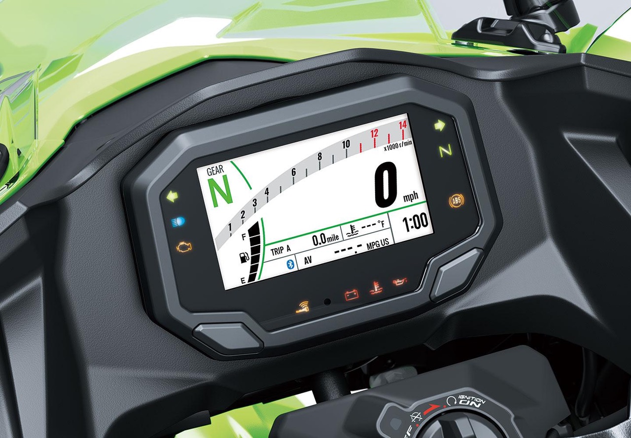 A Ninja 500 está equipada com um painel de instrumentos LCD completo de alto contraste. O design sofisticado do instrumento apresenta um display bem pensado, com um tacômetro estilo barra que alcança o velocímetro e outros dados exibidos. A conectividade com smartphone permite que os ciclistas se conectem com suas máquinas para desfrutar de notificações de exibição, registros de pilotagem e outros recursos.