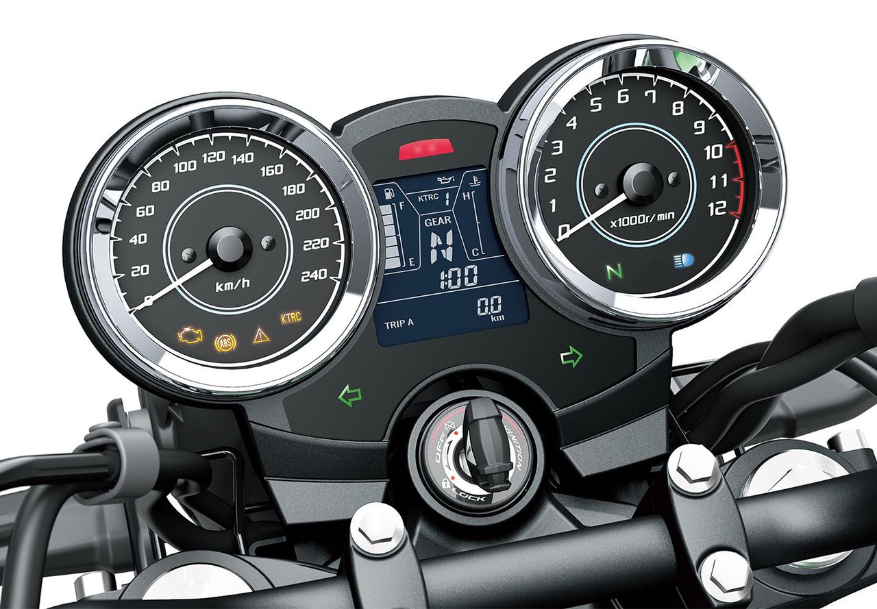 Um tacômetro e velocímetro em estilo analógico são complementados por uma tela em LCD multifuncional, equilibrando o visual retrô com as funcionalidades modernas.