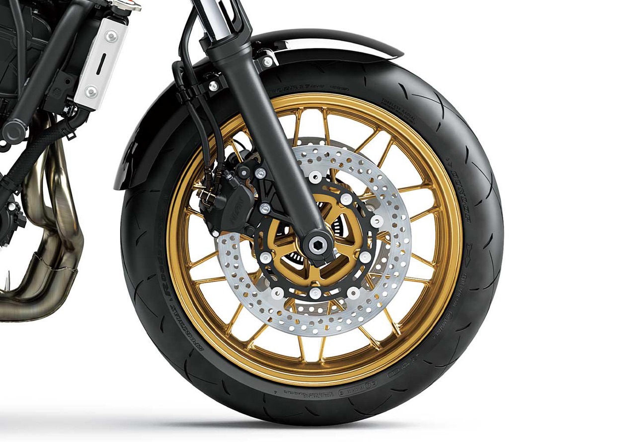 As rodas originais similares as da Z900RS apresentam cinco raios planos desenhados para se parecerem com as clássicas rodas raiadas. As rodas oferecem um equilíbrio entre peso leve e visual elegante, contribuindo para a facilidade no controle e no design adequado para a categoria retrô.